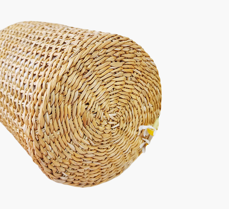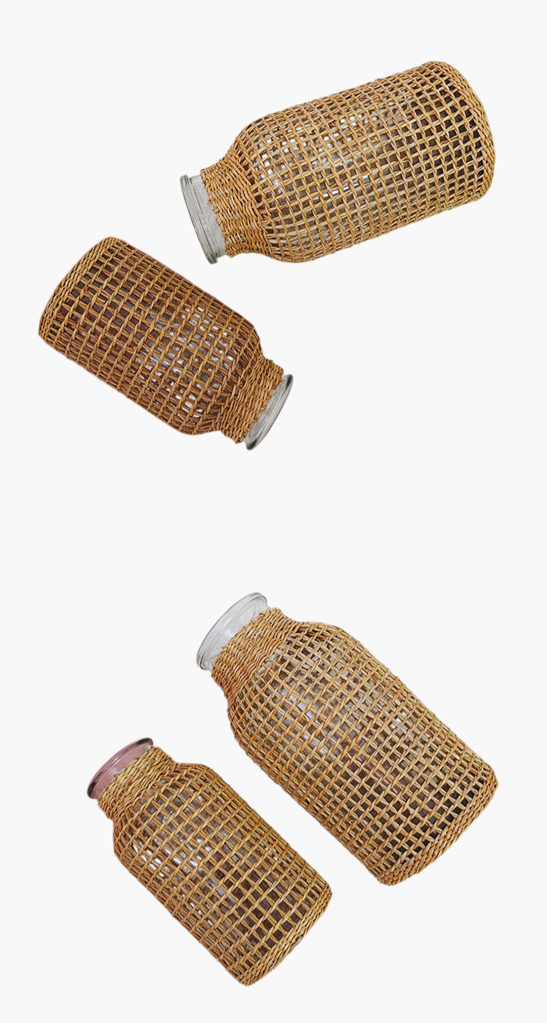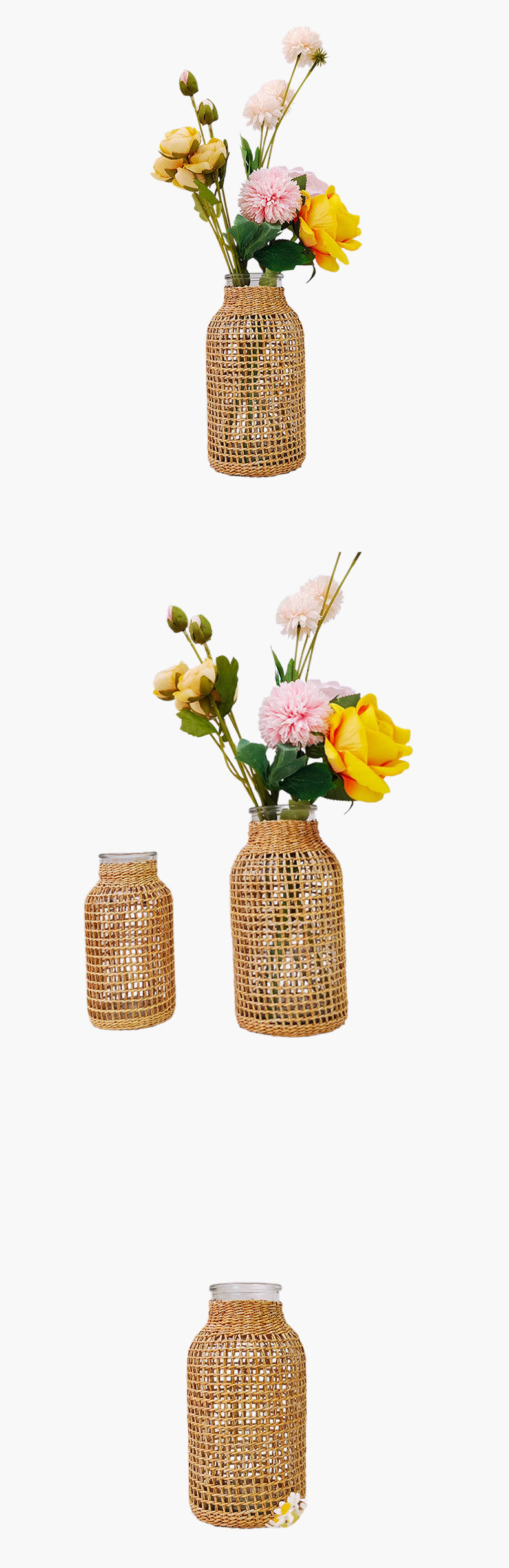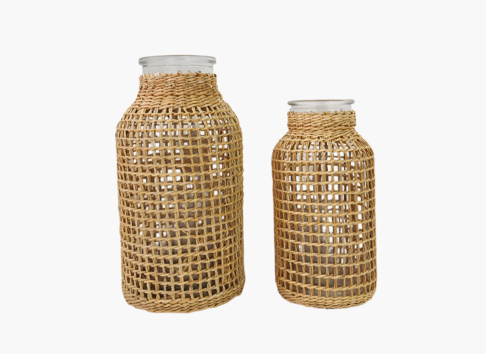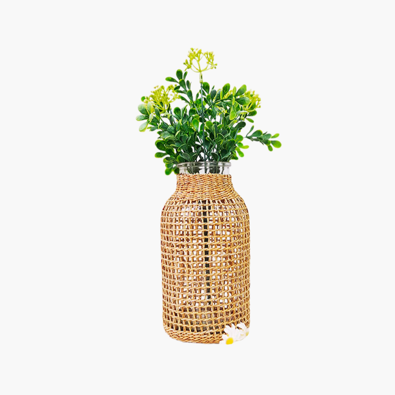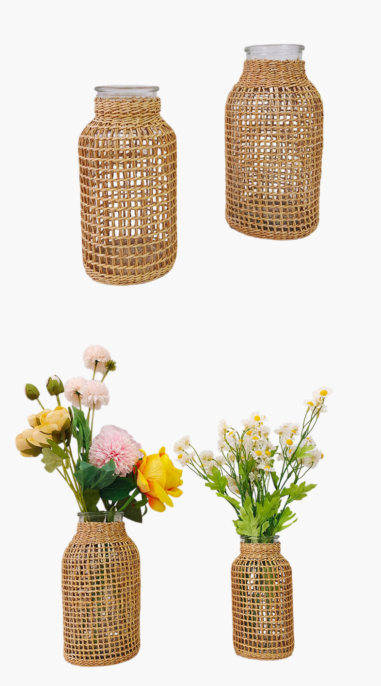 ナチュラルなわら編みとガラスの組合せ。通気性良好、ドライフラワーやインテリアに最適。お手入れ簡単。
